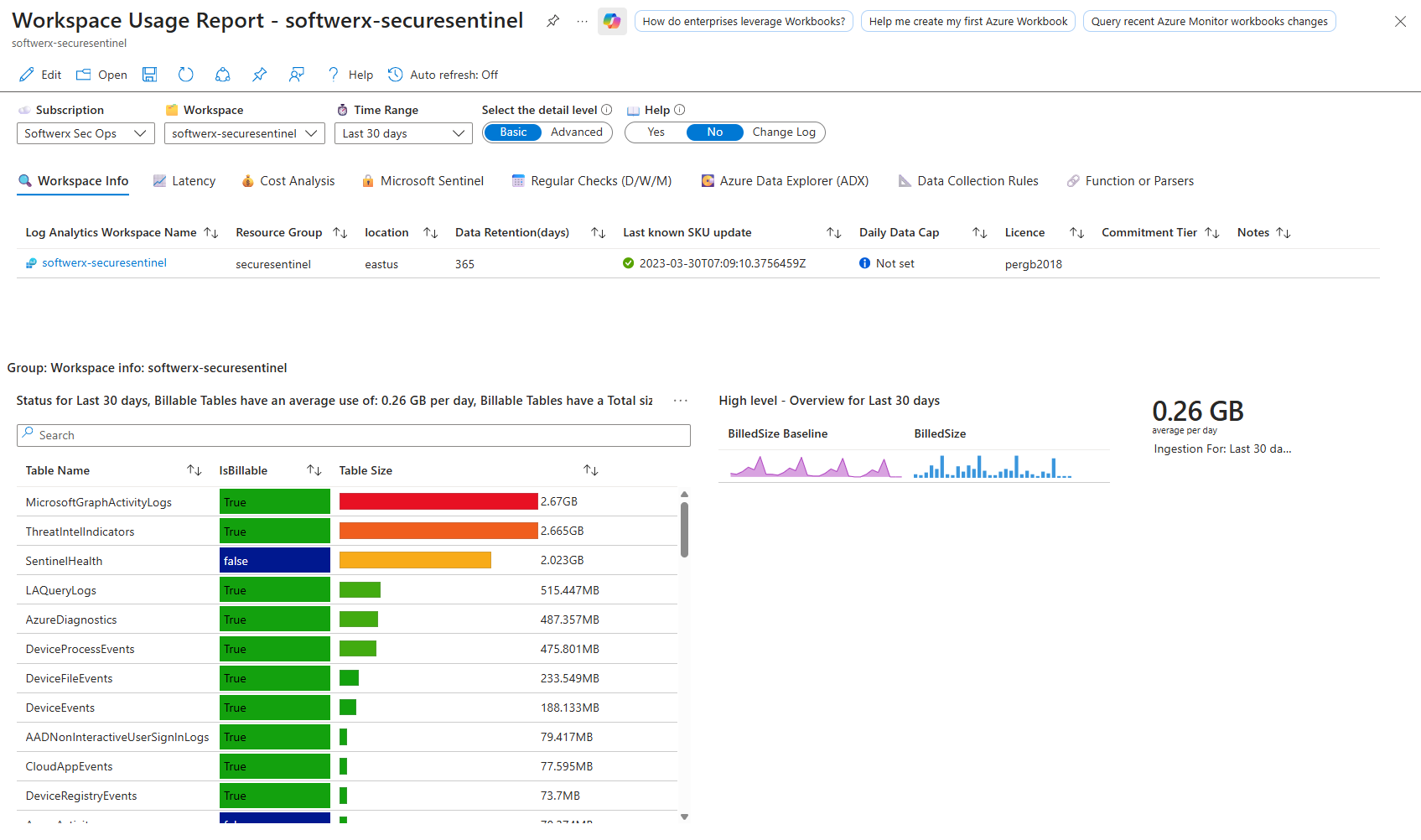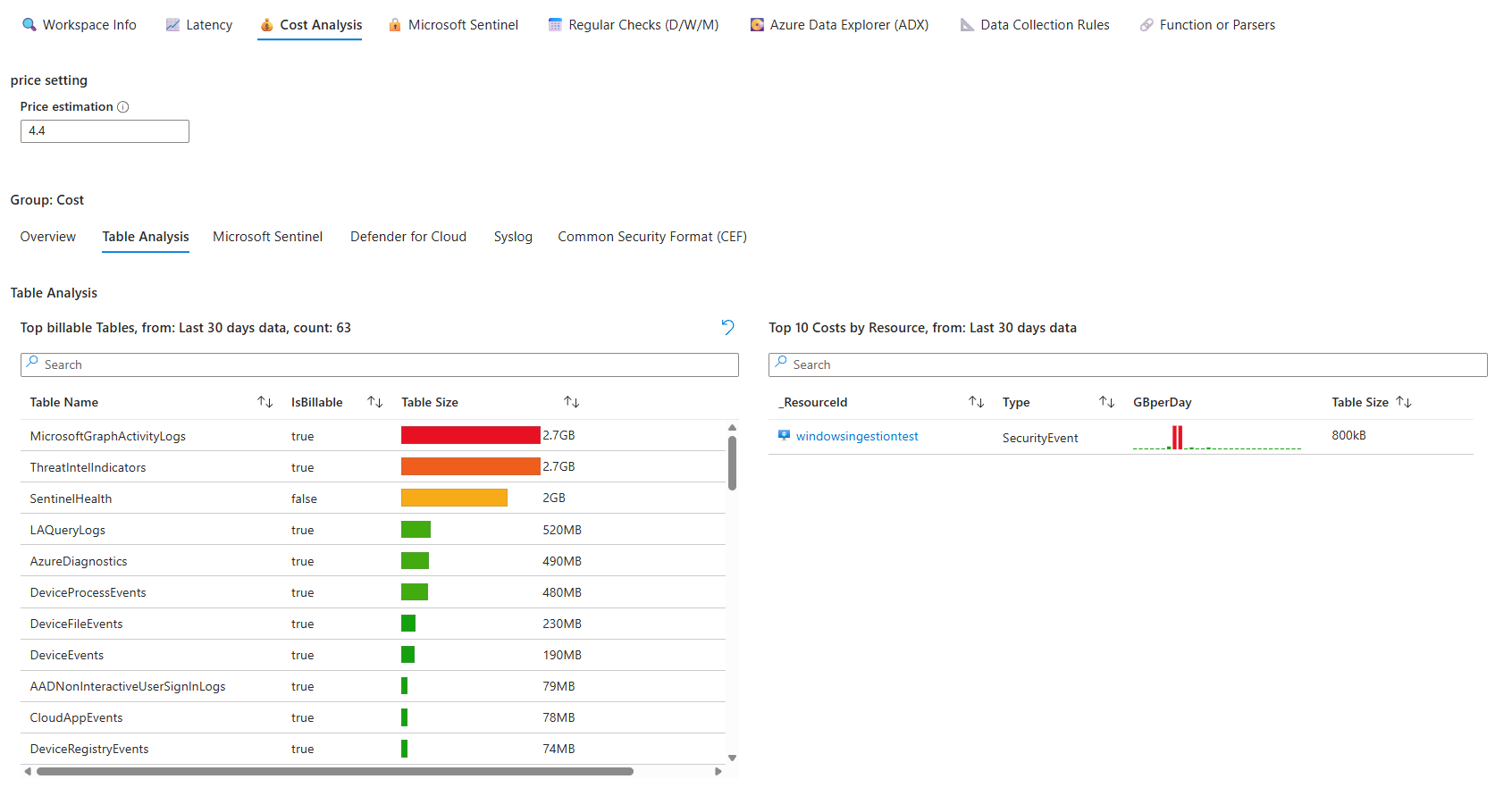 Most critical part: the anomaly detection. Billable table ingestion with sparklines shows which tables have spikes or dips. If SecurityEvent suddenly went from steady 3 GB per day to spiking at 8 GB, that tab flags it instantly. You can then drill down into the table, check for a misconfigured collector, or validate the spike is legitimate before costs spiral.