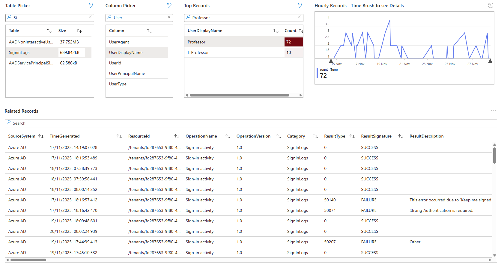 This is where it breaks down the investigation time from minutes to seconds. Your team spots a spike in failed sign-in attempts. Click SigninLogs, pick UserDisplayName and the actual user name, and you instantly see the accounts and IPs involved. One click drills to raw record details.