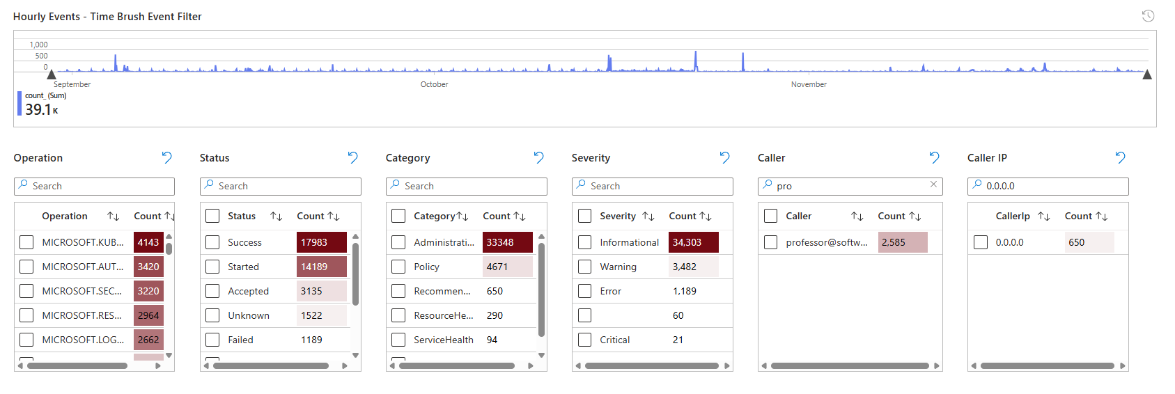 Open it, and you see a time graph at the top showing event frequency. Click on a spike and instantly see which events or operations were happening at that moment. Below it are filters for Source, Identity, Result, Severity, Caller, and many more (depending on the table, of course). Filter by anything, and the results show you only matching records from that table.
