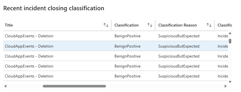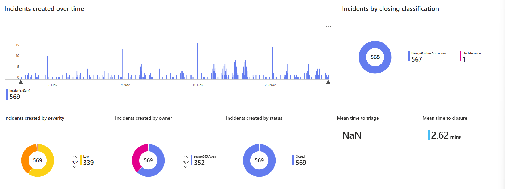 The bottom section shows the recent incident closing classification. Closed manually, closed by automation, detected, etc. This reveals if your playbooks are actually automating triage or if it's all manual work.