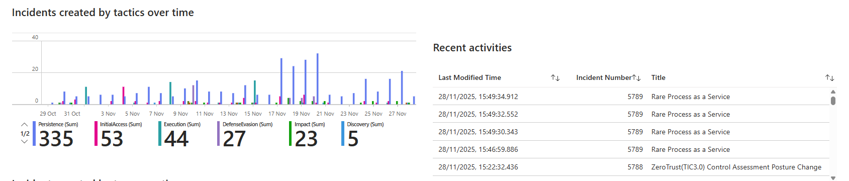 Second useful section: incidents by tactics over time. Shows if your attack surface is shifting. Lots of persistence attacks last week, now it's lateral movement. That tells you where attackers are focusing.